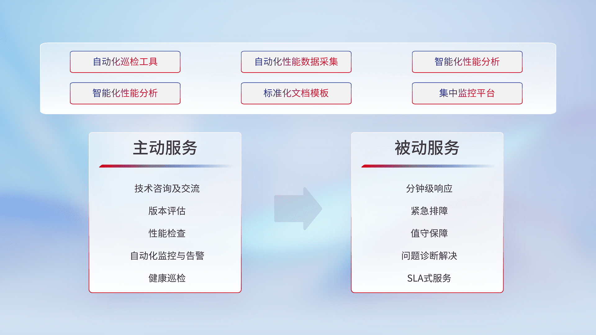 智能化工具和标准化文档,,保障服务质量,,,,提供主动服务(包含技术咨询、、、、版本评估、、、、性能检查、、自动化监控与告警、、、健康巡检)和被动服务包含(分钟级响应、、、、紧急排障、、、值守保障、、问题诊断解决、、SLA服务)。。