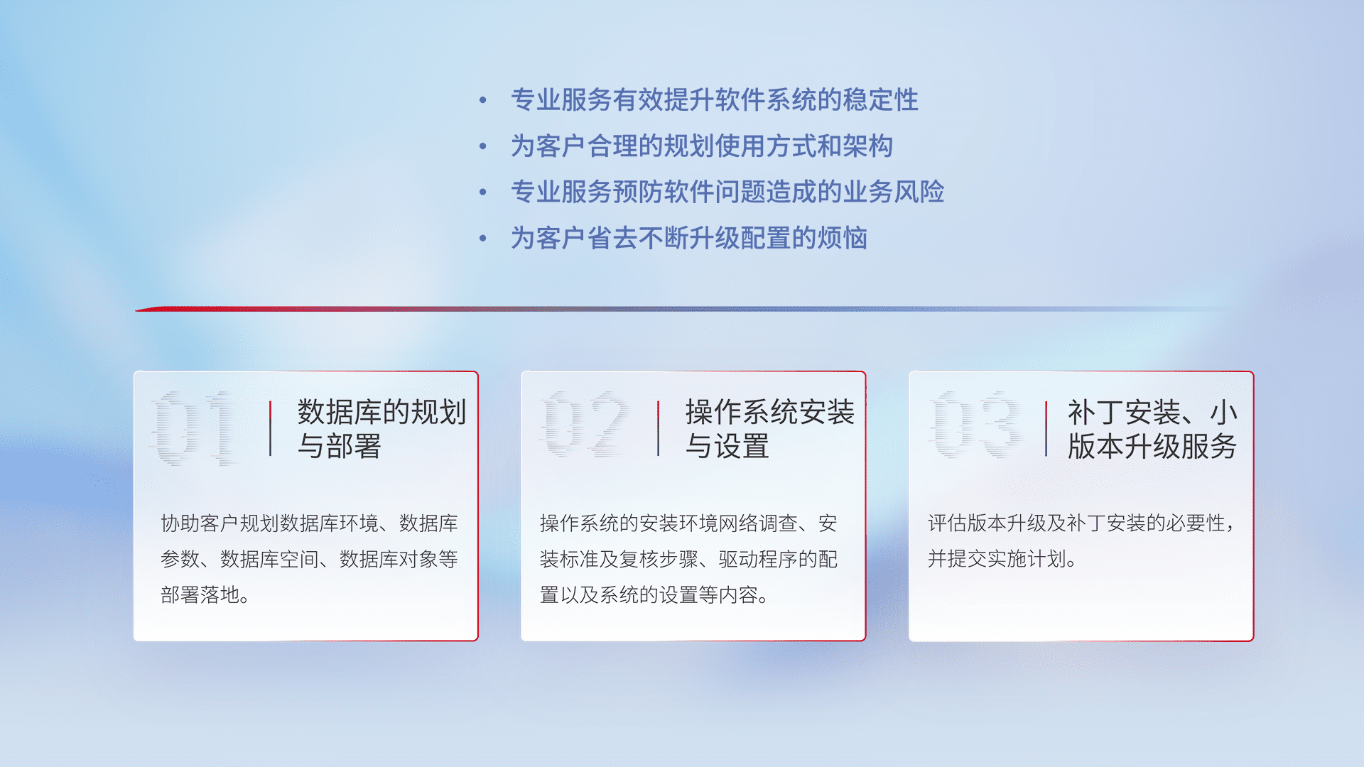为客户提供软件规模升级、、快速部署、、、按需配置的专业服务,,,从数据库的规划与部署到操作系统的安装与设置,,再到补丁安装和小版本升级提供支持。。。